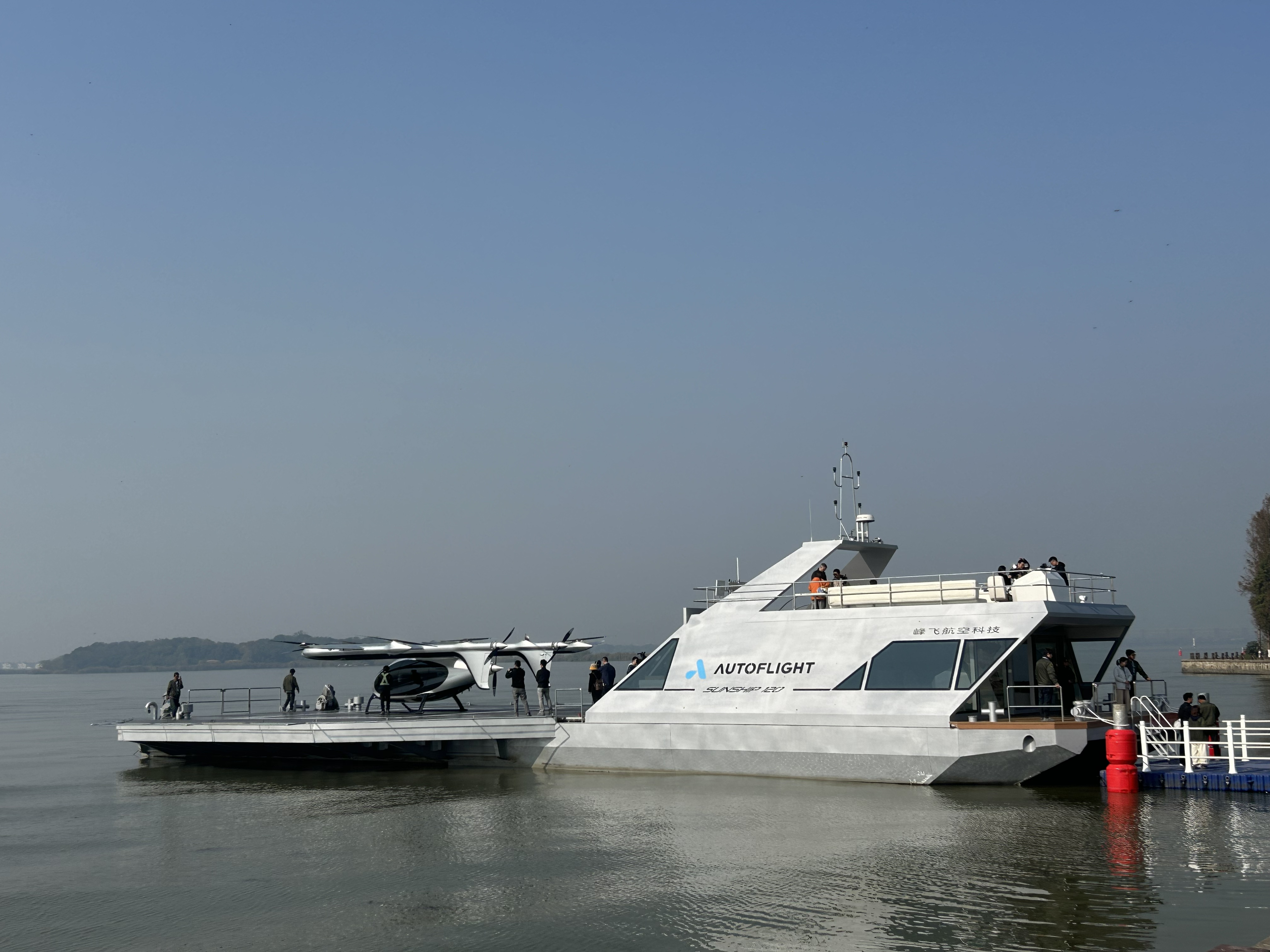 “水上机场”采用纯电驱动,宽大的甲板作为起降平台,船舱则作为候机厅与机务室。技术人员介绍说,航空器能在划定的范围内精准起降,飞行时抵抗7级风力。